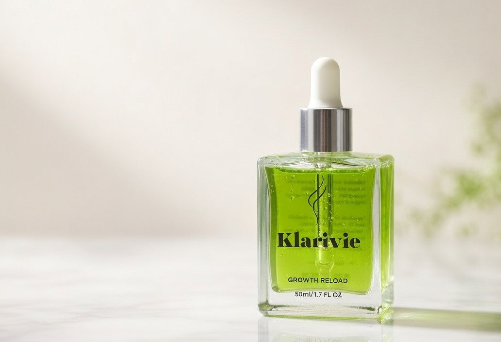 A lightweight, natural hair oil formula, Klarivie Hair Oil, a gentle hair growth oil, designed for consistent, long-term use working from the scalp out to support real, visible results over time.